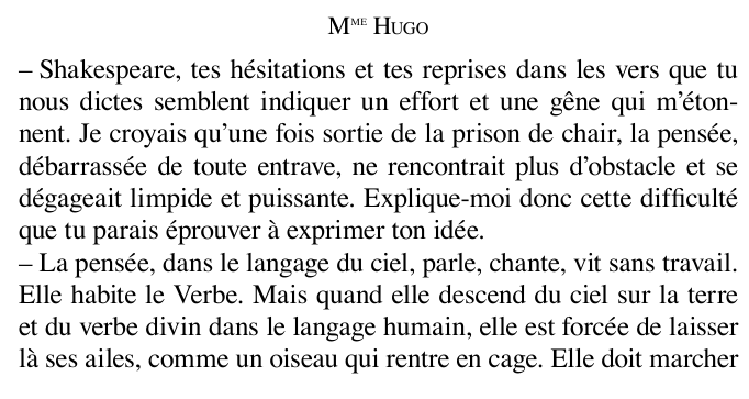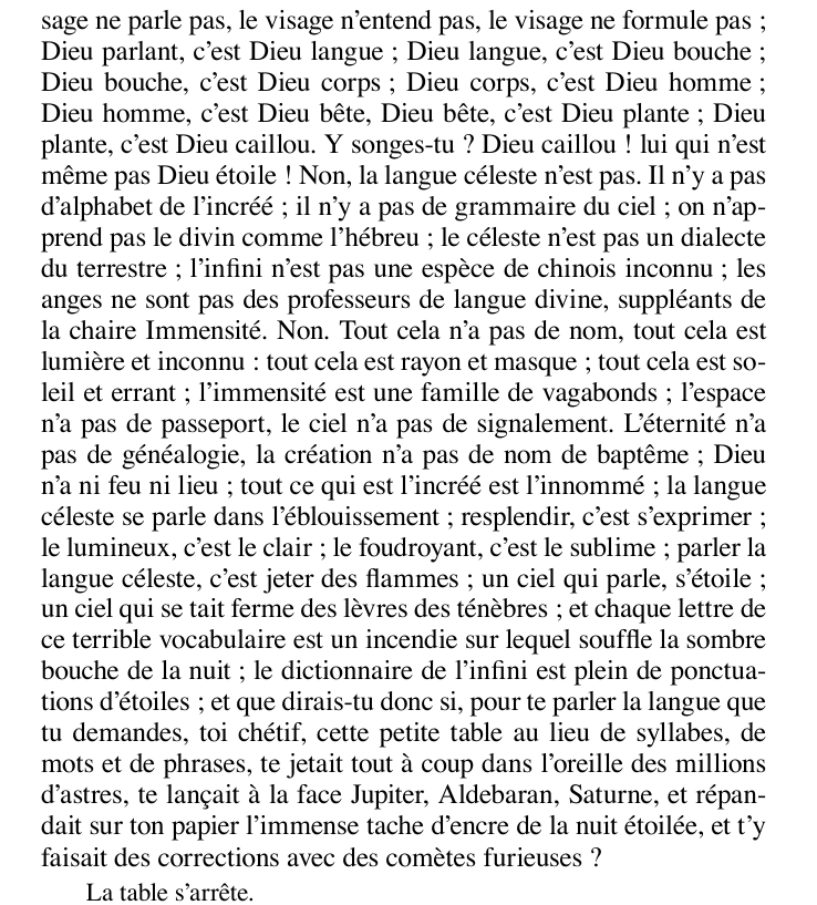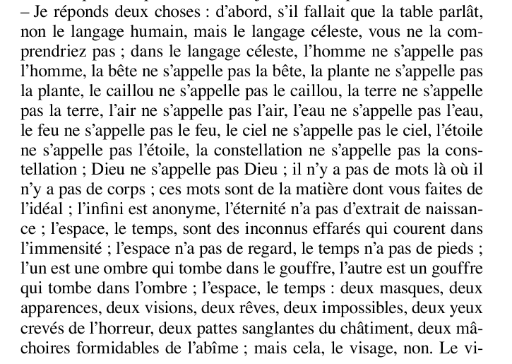 fais attention par contre c'est pas vrai Hugo qui parle dans ce que j'ai cité, c'est les tables qui ont parlé même si elles ont un langage très hugolien, je ne sais pas si le rapport entre la philosophie des tables (dans mes screens Shakespeare, la Mort, Galilée) et la philosophie de Hugo est facile à établir, c'est une question à part entière la place du spiritisme chez Hugo