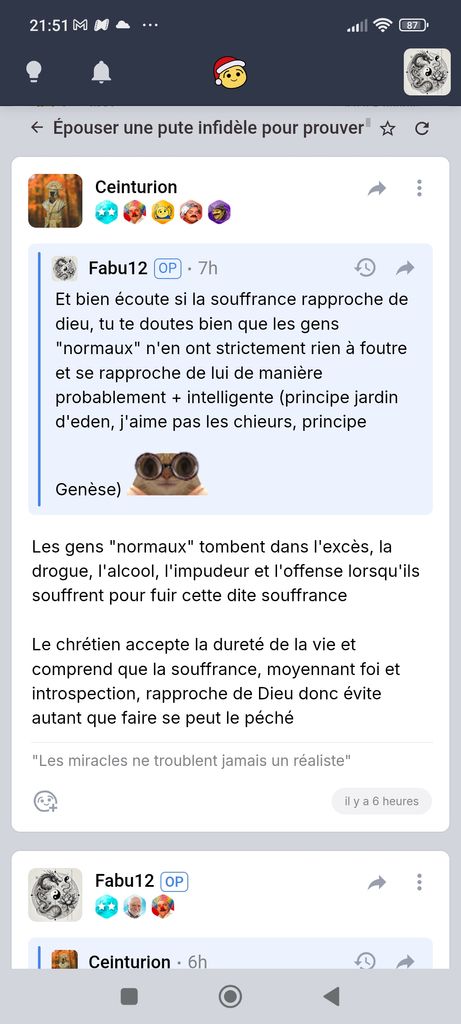Ca ne change rien à ce que j'ai dit, on souffre tous, la vie est pavée de souffrance. Le religieux, en général, use de cette souffrance pour se rapprocher du divin et certaines personnes, athée ou agnostiques ou même croyant, sombrent dans le péché et l'excès