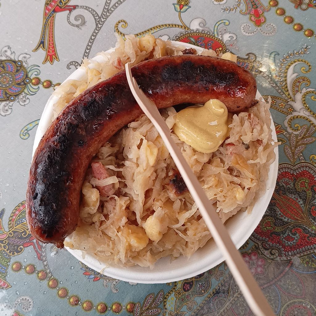 Perso hier au marché de Noël je me suis fait Knepfla choucroute avec une saucisse aux épices de Noël et une bière de Noël