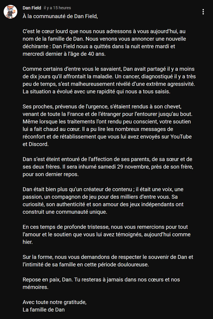 Je l'ai appris ce matin, triste car c'est l'un des seuls youtubeurs fr que je regardais assez régulièrement