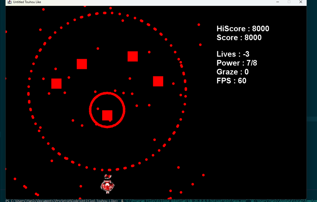 J'ai fait tout le moteur de base, les entités, système de tir, collisions, déplacements etc.. Mon pote a optimisé le bordel et rajouté la serialization JSON pour créer des niveaux personnalisés en Json, et des patterns mathématiques que j'avais commencé.