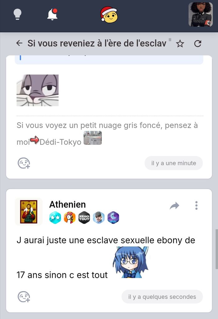 encore un autre zinzin qui débarque, aka le "catholique" qui passe son temps a avoir la haine de tout le monde , boucle h24 sur les "bougnoules" et en plus il met un avatar avec une icone du Christ, j'oserais jamais faire ça je sais pas comment il fait avec les horreurs qu'il écrit parfois