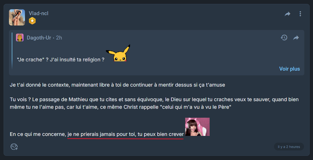 J'assume tout mes propos, et je réitère si tu veux, tu peux crever pour que je prie un jour pour toi