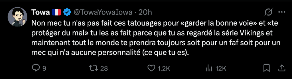 Ça pourrait devenir un bon délire ça, " fachiser" les tatouages les plus courants des meufs spé piercing au nez en en faisant des symboles de droitard
