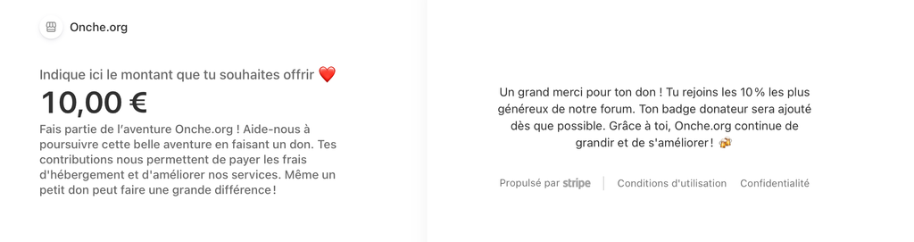 Malgré le fait qu'un admin farceur m'ait retiré un niveau quand j'ai célébré mon badge argent au travers d'un topic il y a quelques jours, je ne suis pas rancunier et j'ai fait mon don.