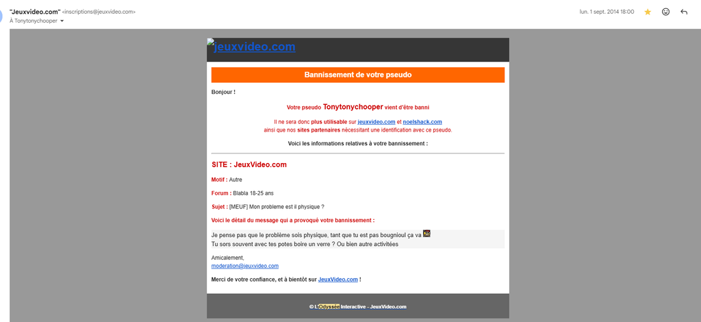 Je faisais une recherche dans ma boite mail, jusqu'au mail de bannissement de JVC