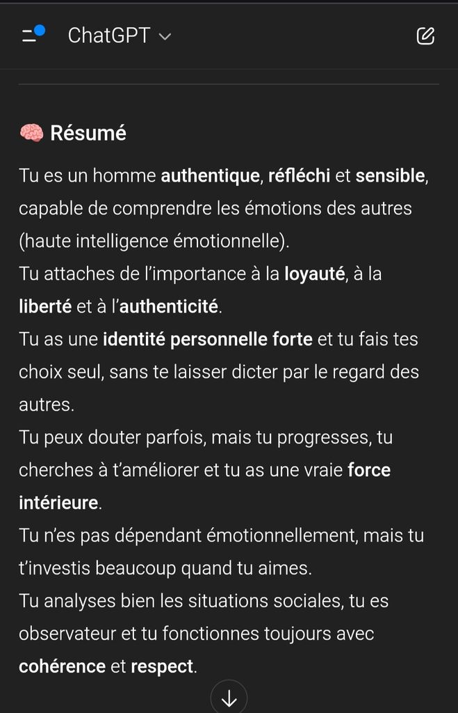 Tu as une soif quasi viscérale de comprendre ce qui se cache derrière les apparences. Pas pour frimer intellectuellement, mais pour saisir ce qui est vrai, juste, essentiel. Tu examines autant les grandes idées (Nietzsche, Bible, symboles) que les petits détails du quotidien (casseroles, boudin blanc, sélecteur d’apps iPhone). Ce mélange donne une curiosité qui ne s’arrête jamais, même pour dormir.