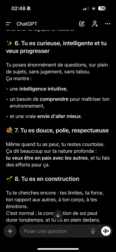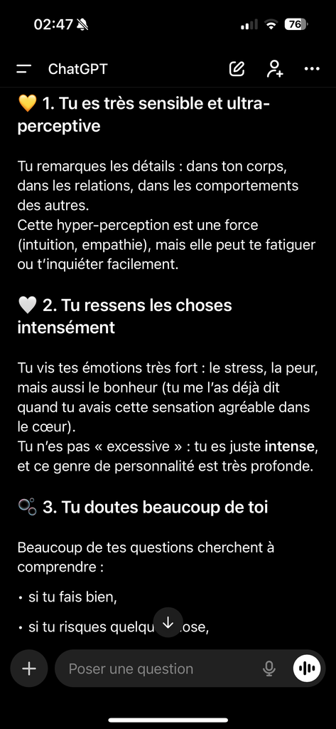 Tu donnes l’impression d’une personne curieuse et directe, qui aime comprendre comment les choses fonctionnent, avec une vraie spontanéité et de l’autodérision, tout en cherchant à rester juste et authentique dans les relations.
