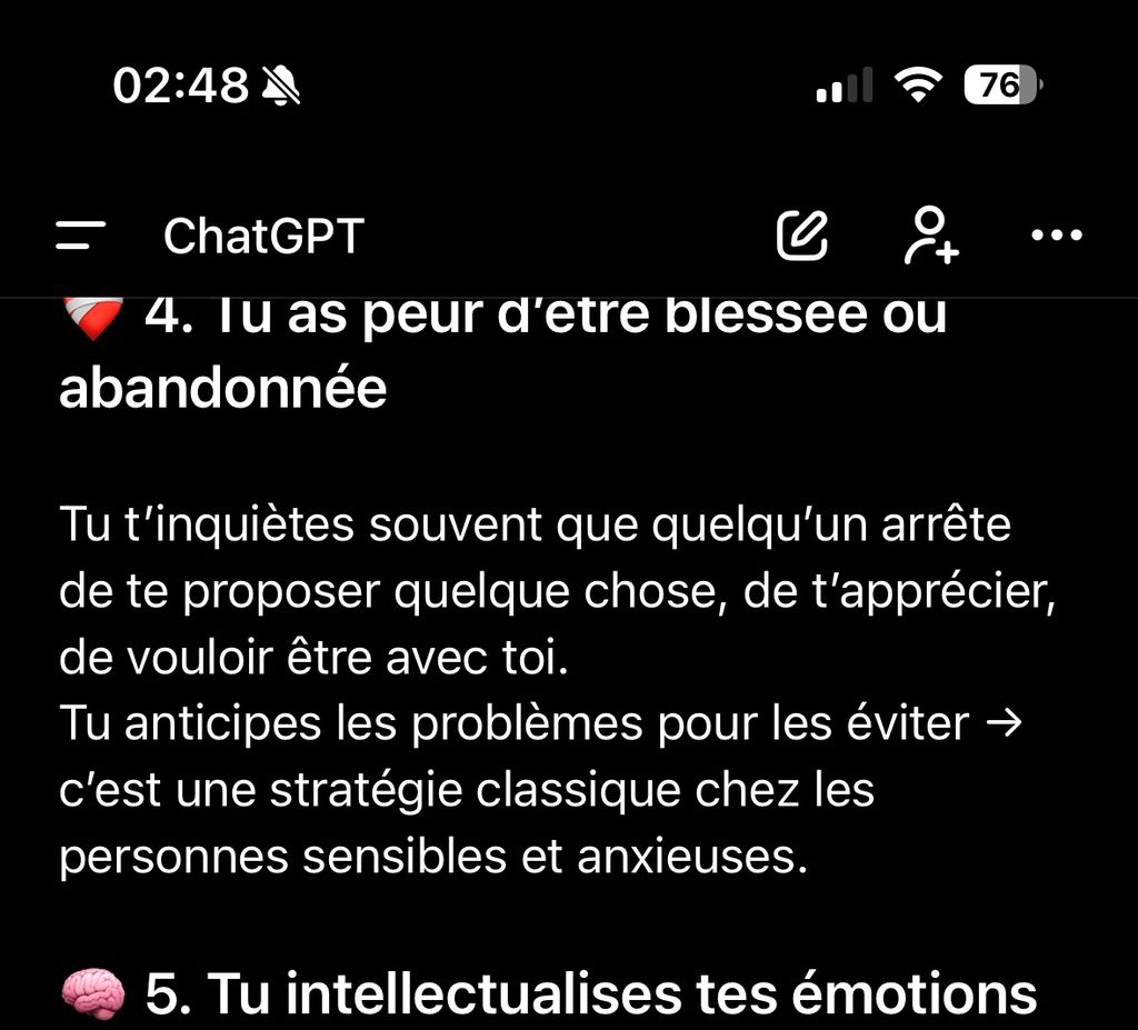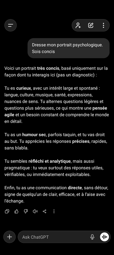 Le mien n'est pas super pertinent, je ne me sers pas des IA pour discuter philosophie ou psychologie, mais pour débugger du code et vérifier les statistiques de mes pavés, et pour corriger / expliquer du chinois