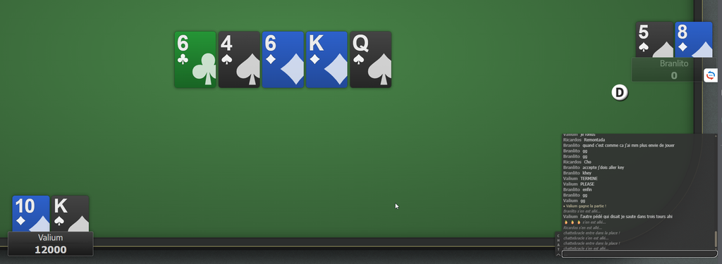 8ème : D séléctionné par Branlito avec Couleur au Roi de Pique contre Hauteur As à l'issue de la manche n°5