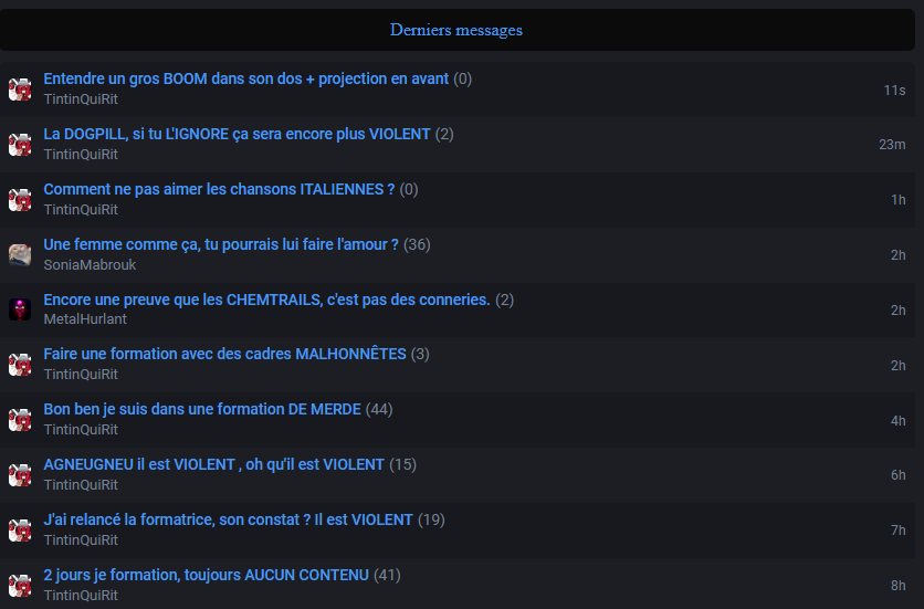 Tu dénonces des forumeurs nominativement sur un topic appelé le Mur de la Honte. Ça rappelle les méthodes du syndicat de la magistrature.