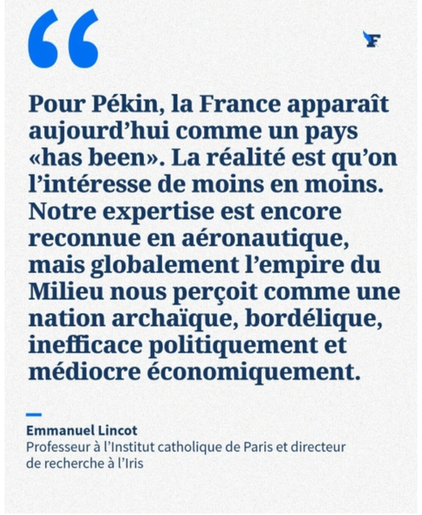 La France est aux ordres économique du PCC (cela ne signifie pas qu'il n'y a pas d'autres lobby très puissants et médiatiques comme l'israélien).