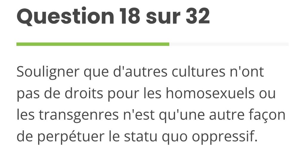 En gros comme je l'ai compris comme si tu dis tel culture est dangereuse ou problématique car ils n'accordent aucun droit au homo/trans alors tu es un sale nazi oppressif. Ce qu'ils ont oublié de dire c'est qu'en général quand une culture omet la possibilité pour une personne d'être gay ou trans s'est parcequ'ils les tuent comme des chiens et que leur cadavre est balancé dans une rivière et oublié de tous