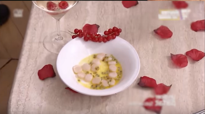 Entrée : Saint-Jacques poêlées, condiment échalote-piment, salade de pomme-radis, pain au graines de pavot