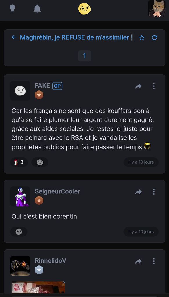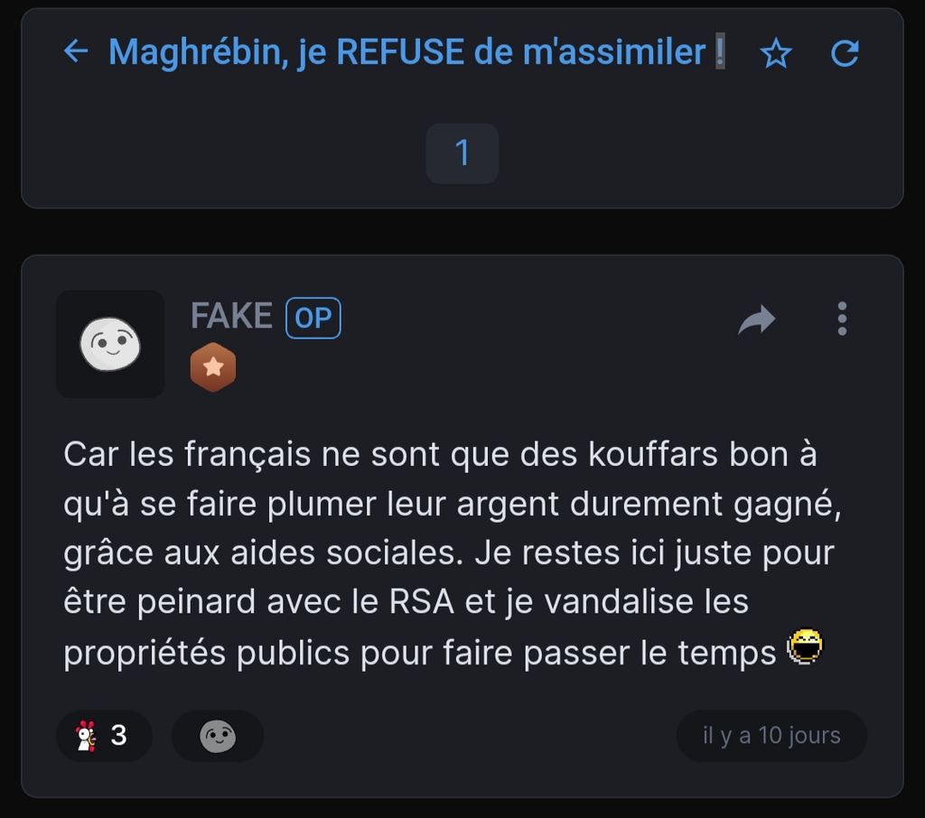 La quasi totalité des "racistes" oseront pas te confronter, même à 10 vs 1. Le golem est pire, parce que lui est soutenu par ses maîtres à penser et est plus confiant dans la confrontation.