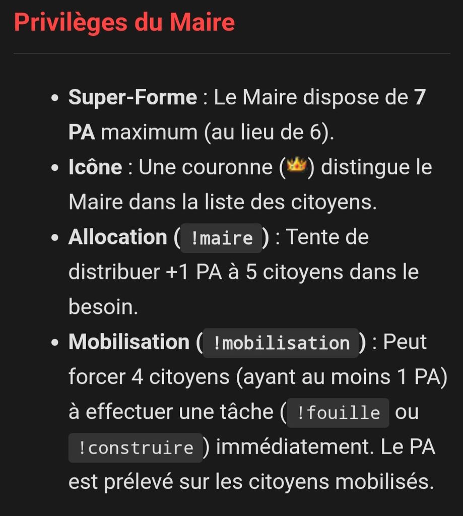 - !maire (Maire uniquement) : Tente de distribuer des PA aux citoyens. (0 PA et cooldown de 1h)