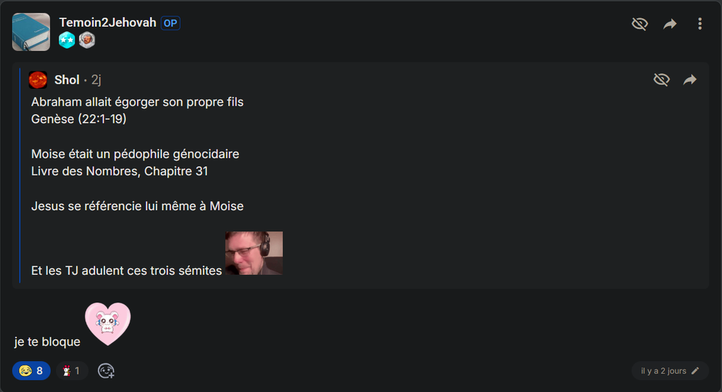 Ça c'est uniquement ton interprétation personnelle tu utilises deux parties de la Bible totalement différente en essayant de créer un lien qui n'existe pas
