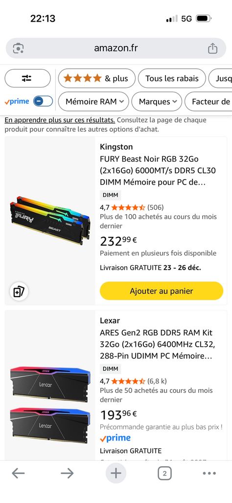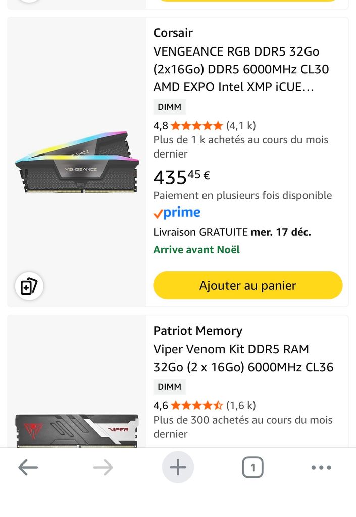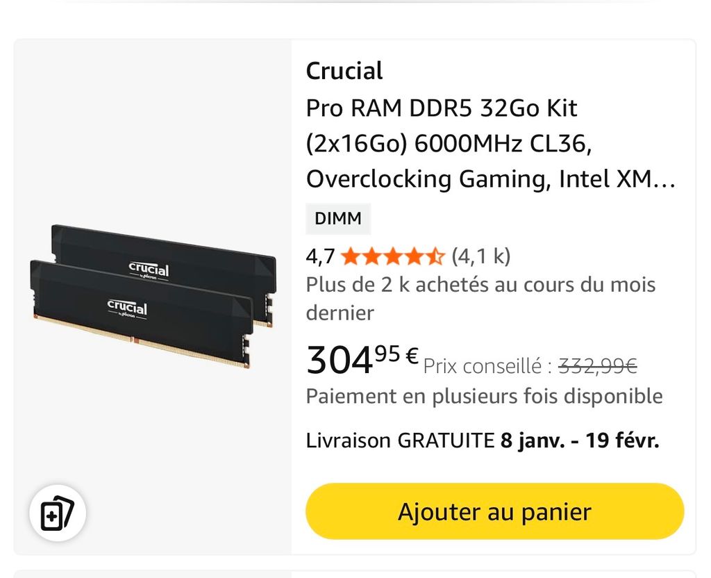 Aya j'avais acheté 2 barettes de RAM crucial de 16Go DDR5 70e y a 6 mois