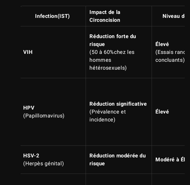 C'est l'effet le plus documenté. Les essais cliniques ont montré que la circoncision masculine réduisait le risque d'acquisition du VIH par les hommes hétérosexuels de 50 à 60%.