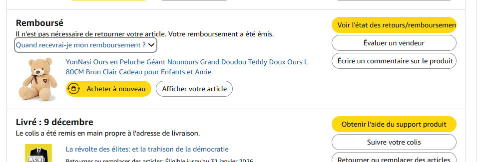 Et j'ai pris un gros nounours pour madame et amazon me l'a remboursé car le livreur a oublié de déclaré qu'il a bien été livré