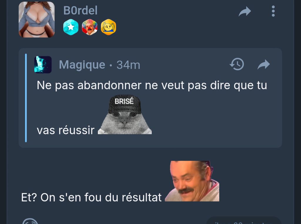 t'es ultra con toi non? ils ont raison, on s'en fiche du résultat, l'auteur ne doit pas abandonner, c'est normal de subir des echecs mais il faut toujours persévérer.