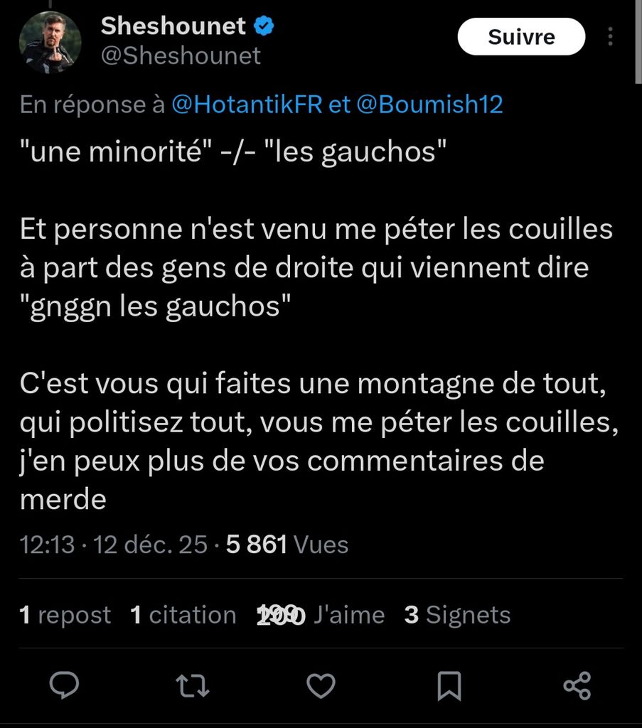 Là le sheshounet ce qu'il dit en gros, c'est "coucouche panier" aux droitards qui croient avoir le droit de répondre au météquat afrançais. Donc en résumé c'est un gros "c'est bon ferme ta gueule" des familles qu'il leur lance. Maintenant que le gaulois se défend, il exprime son agacement et nie le problème pour les faire passer pour des blaireaux et leur fermer leur gueule...