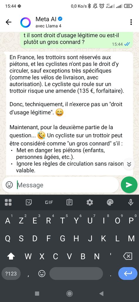 Mais, j'ai UN VTT ma place est sur la route , le trottoir, l'escalier, les champs ,sentier et bien sûr piste cyclable