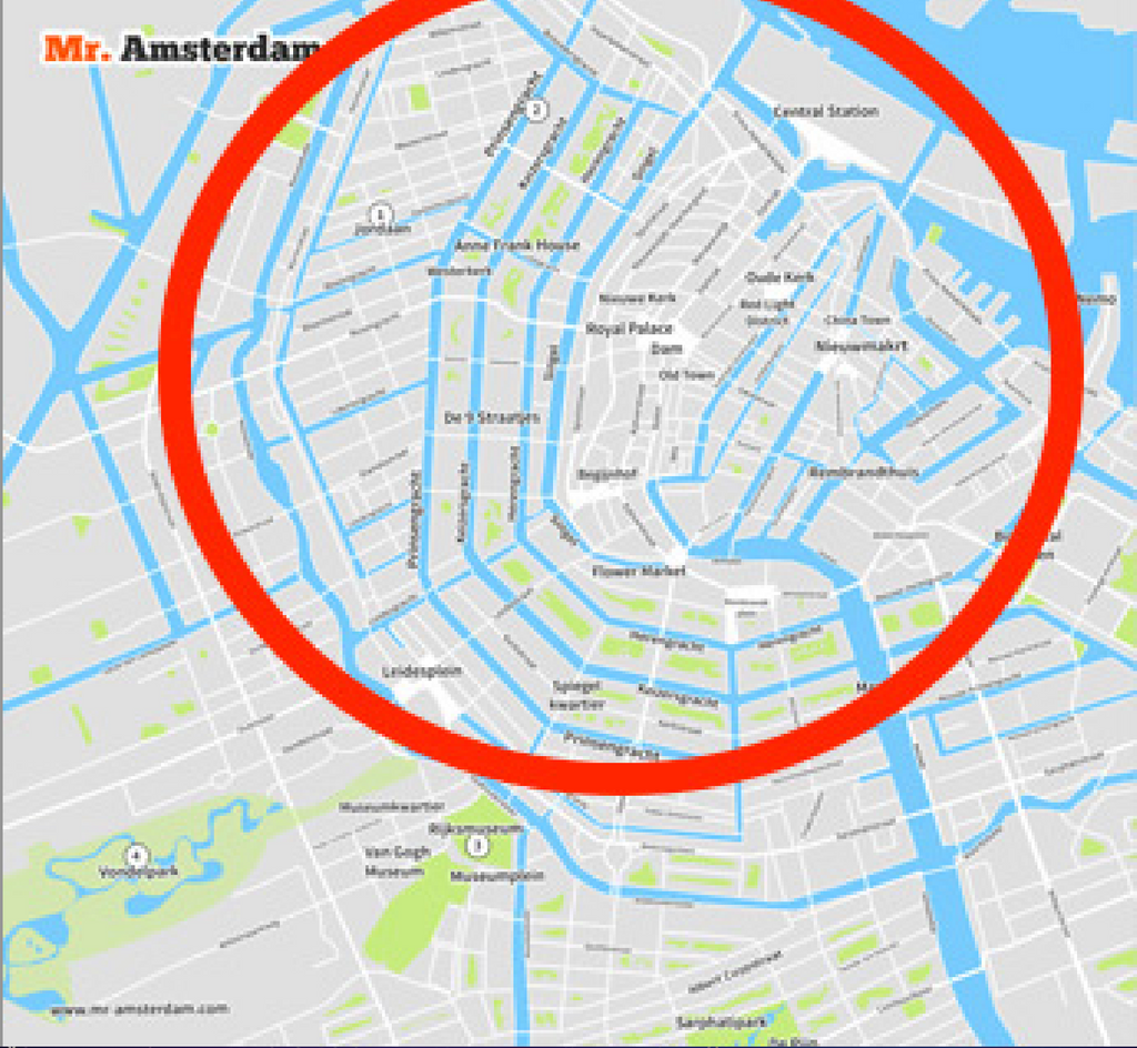 Ça c'est Amsterdam, et en rouge, la zone ou j'ai zoné non-stop (c'est très grand, il faut 1h30 de marche pour aller d'un bout à l'autre)