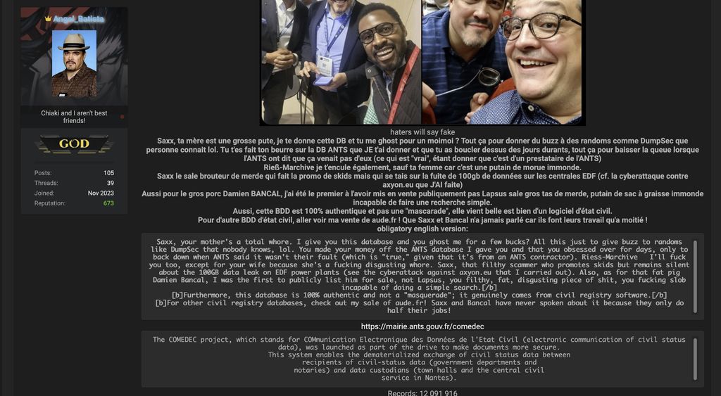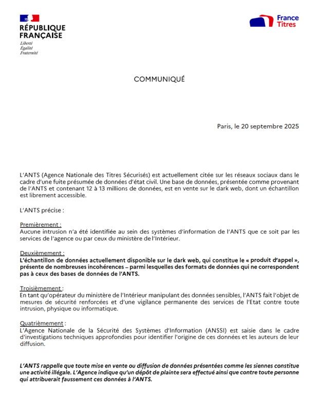 La fuite contiendrait les données de l'ANTS ayant fait l'objet d'un débat sur la réalité de la fuite à l'automne et contient 12 091 916 données de citoyens Français venant des BDD de mairies. [Nom - Prénom - Adresse - Identité conjoint(e) - Coordonnées tel - Date naissance / décès - Email]