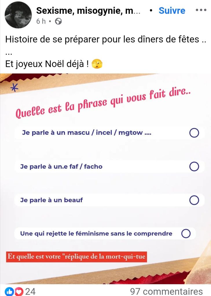 Le truc qui est vraiment drôle c'est qu'ils (vu qu'il existes des hommes féministes...) ne captent pas que chier sur un prétendu masculinisme tout en defendant ca montre juste un parti pris évident
