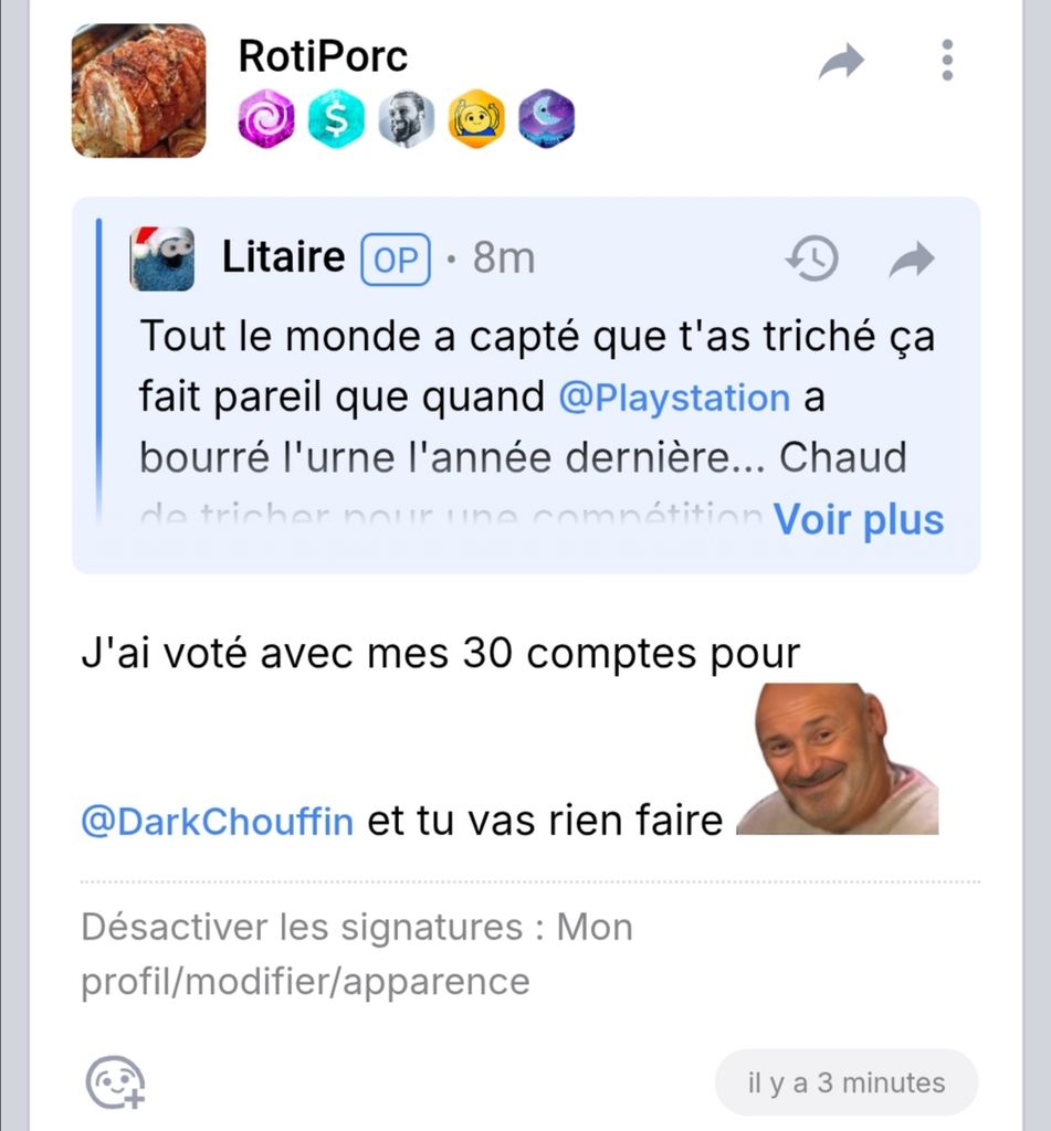 Et sinon j'ai des aveux de RotiPorc qui admet avoir bourré l'urne avec 30 comptes differents