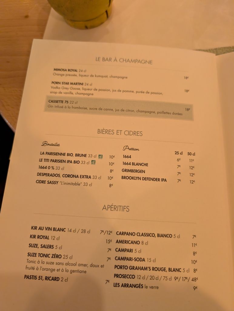 Ça va pour paris les prix ne sont pas si excessif.... c'est les mêmes prix à 2e près chez les estaminets Lillois....