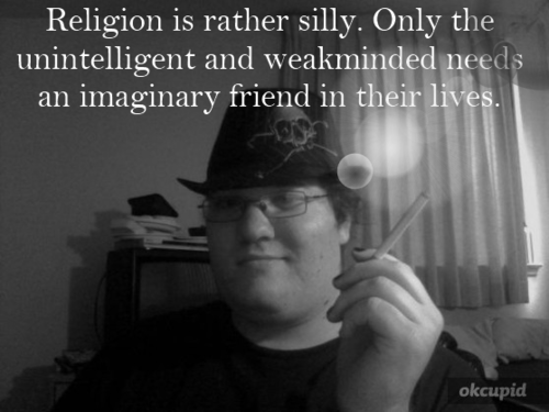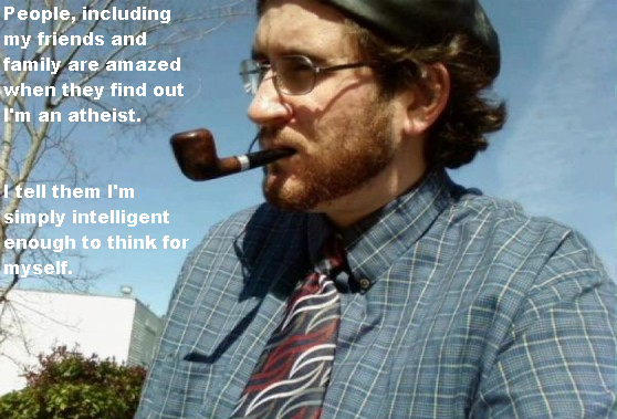 Je ne dirais pas athée mais athée revendiqué! J’en connaît un qui est toujours fier de s’en distinguer. Et il ressemble exactement à ce que tu as posté