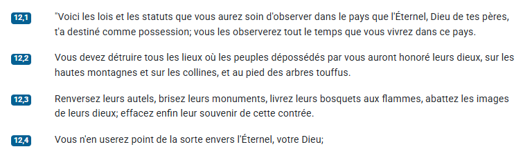 Vous détruirez tous les lieux où les nations que vous allez chasser servent leurs dieux, sur les hautes montagnes, sur les collines, et sous tout arbre vert. 3Vous renverserez leurs autels, vous briserez leurs statues, vous brûlerez au feu leurs idoles, vous abattrez les images taillées de leurs dieux, et vous ferez disparaître leurs noms de ces lieux-là.
