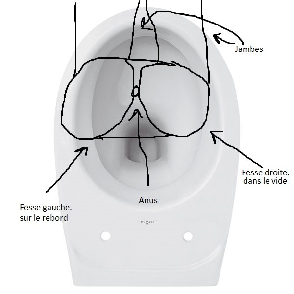 C'est ici que ça se complique. Pour pas que tu t'étale de la merde sur tes jolies petites fesses, je vais te donner un tuyau, schéma à l'appui. Au MOMENT de t'asseoir, tu pose ta fesse gauche sur le bord de la lunette gauche (ou droit sur la lunette droite). A cet instant tu te décale sur le coté opposé en ne bougeant pas ta fesse, de sorte à éloigner tes deux fesses l'une de l'autre, permettant un angle d'ouverture plus grand pour ton ANUS.