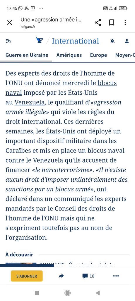 Ce blocus, imposé contre des pétroliers considérés comme étant sous sanctions, constitue selon eux «un usage interdit de la force militaire» contre un autre État, en vertu de l'article 2 de la Charte des Nations unies. «Il s'agit d'un usage de la force si grave qu'il est expressément reconnu comme une agression armée illégale au sens de la définition de l'agression adoptée par l'Assemblée générale en 1974», ont-ils encore précisé, indiquant que cela confère en principe «à l'État victime un droit de légitime défense».