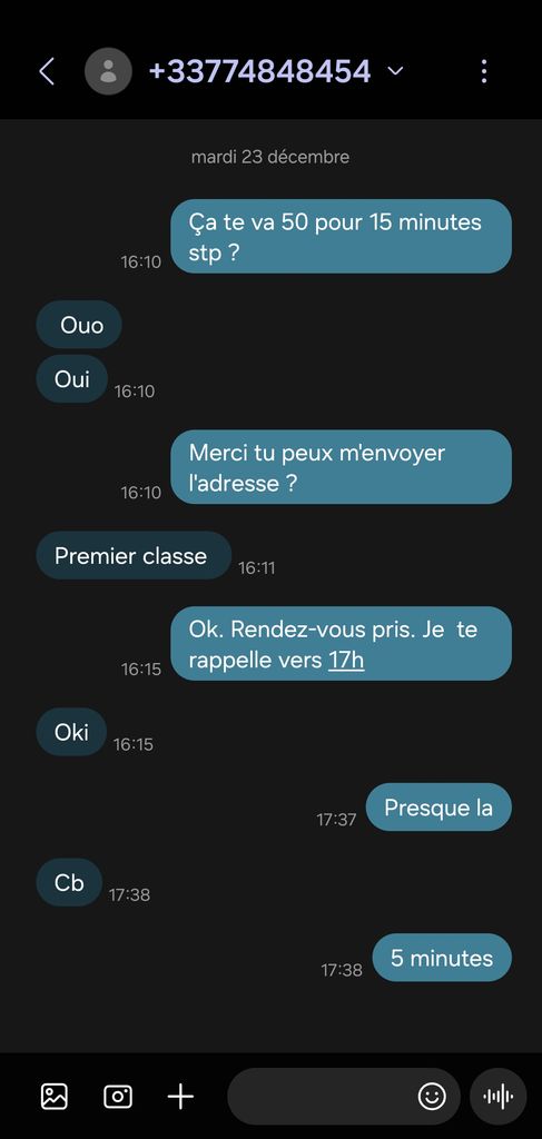 Faut savoir que son téléphone a sonné 2 ou 3 fois pendant les 15 minutes ou j'étais dans sa chambre d'hôtel cheap de merde