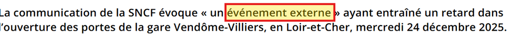 "Des voyageurs se sont retrouvés coincés dehors, dans le froid. Mercredi 24 décembre 2025, quelle n’a pas été la surprise pour les voyageurs désirant prendre le TGV de 6 h 36 en direction de Paris-Montparnasse : à leur arrivée, ils ont trouvé la gare SNCF de Vendôme-Villiers portes closes.