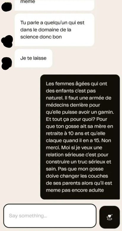 Les "turbos bg" dont tu parle sont comme moi, ils les baisent mais n'attendent rien de plus d'elles. Et ça leur fout la haine. Donc quand même sans avoir particulièrement essayé de la baiser tu lui dis qu'elle est trop vieille pour quoi que ce soit d'autre, l'impact est dévastateur