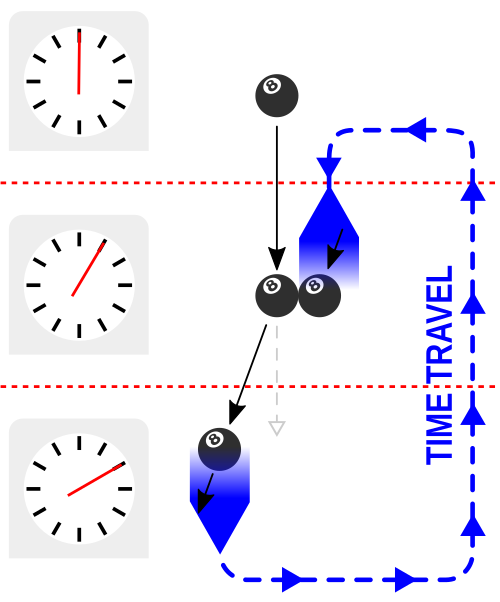 Bas : La boule de billard a changé sa trajectoire de telle manière que celle-ci va voyager dans le temps (vers le passé) avec l'angle nécessaire pour procurer à sa version précédente le coup oblique.