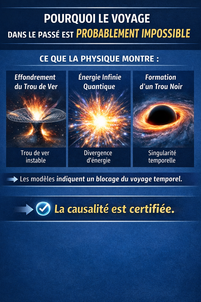 Exact. Voyager vers le futur est théoriquement possible grâce à la dilatation du temps ou un trou de ver, car ça ne viole pas la causalité. En revanche, revenir dans le passé est strictement impossible selon la physique actuelle, les calculs montrent que les particules quantiques formeraient des boucles, l’énergie deviendrait infinie, et le trou de ver s’effondrerait ou se transformerait en trou noir, protégeant ainsi le passé.