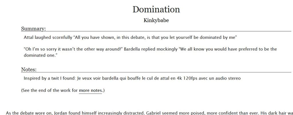La fanfiction "le poids du monde" aurait été retirée de wattpad pour des raisons mystérieuses (demande du gouvernement ?) mais les rumeurs de couloir disent que c'était l'une des plus incroyables sur Bardella et Attal