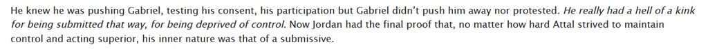 "Il savait qu’il poussait Gabriel, qu’il testait son consentement, sa participation, mais Gabriel ne l’a pas repoussé ni n’a protesté. Il avait vraiment un sacré penchant pour être soumis de cette façon, pour être privé de tout contrôle. Désormais, Jordan avait la preuve ultime que, peu importe les efforts d’Attal pour garder le contrôle et jouer la supériorité, sa nature profonde était celle d’un soumis.."