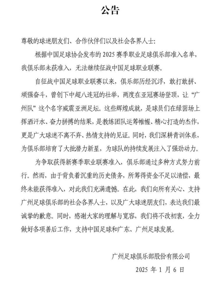 Guangzhou Evergrande ne sera plus dans le football professionnel chinois pour la saison 2025 en raison de l'endettement du club.