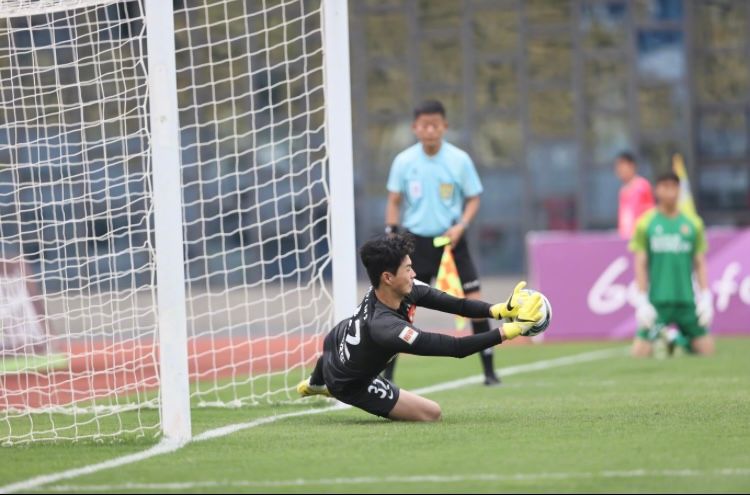 Hao Yang transforme le penalty, Deng Xiaofei gardien du Jinan Xingzhou plonge du bon côté mais un poil trop tard.
