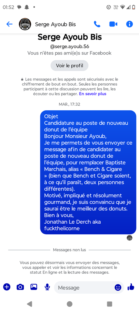 Ayaa serge Ayoub a vu mon message pour être donuts mais ne m'as pas répondu