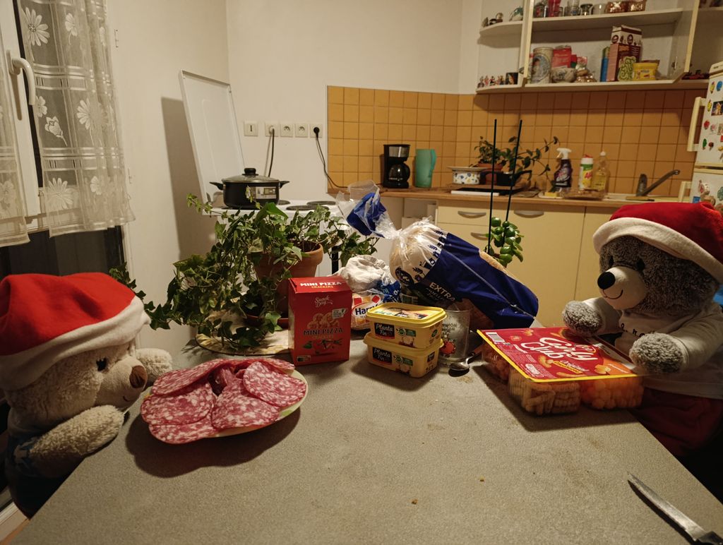 Table dégarnie, repas essentiellement utilitaire et figurines et jouets dans un lieu totalement inadéquat pour ça.