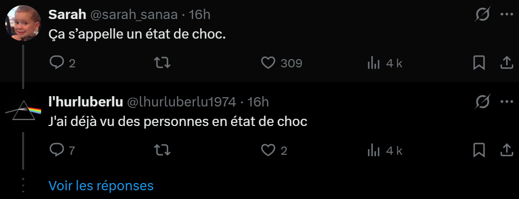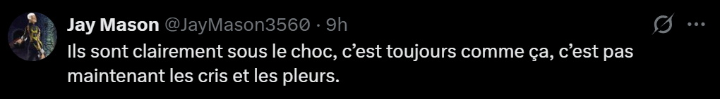 Je suis toujours chaud pour cracher sur les quoicoubix mais là je pense qu'ils méritent au moins le bénéfice du doute, ça peut être une réaction "normale" (pour autant qu'on puisse parler de normalité avec des évènements pareils), surtout qu'ils ont probablement encore pas mal d'alcool + une nuit blanche dans la gueule