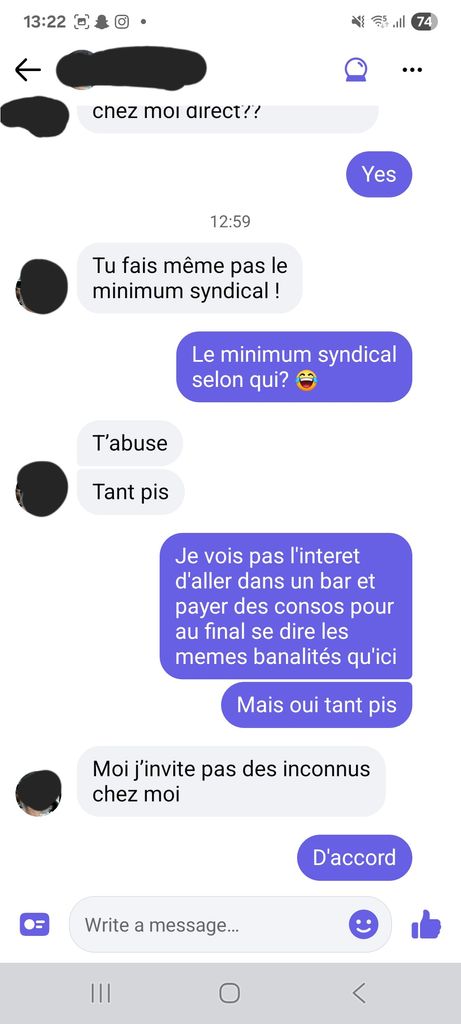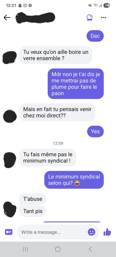 La meuf vous parle de cul pendant une journée entière, de son vibro qui lui suce le clit etc. Et derrière elle vous demande de venir AU BAR car pour elle c'est "LE MINIMUM SYNDICAL". Alors que tout pourrait directement se régler par une baise à domicile.
