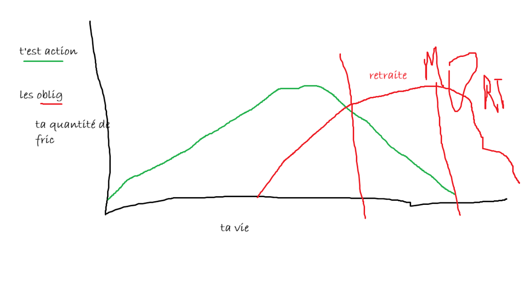 en faite toute ta vie tu vas être en marché action, puis le but c'est plus tu rapproches de la fin plus tu vas vendre t'est action pour pouvoir en profité pour ta retraite et en reconfiguré en oblig pour sécurisé et cela permet de suivre l'inflation en partie, si ta banque central fait le travail